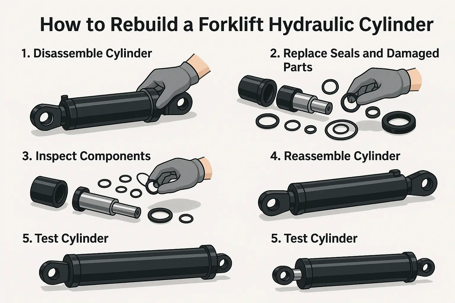 Ребуилдинг ахидраулични цилиндар виљушкараније тако лако као једноставно одвртање и замена гуменог прстена. Цео процес укључује више корака, и сваки корак се мора пажљиво руковати, иначе неће трајати неколико дана након што се поново инсталира.