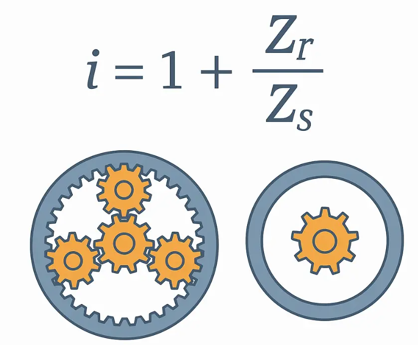 Формула за израчунавање преносног односа планетарног редуктора заправо није компликована. Најчешћа структура је да је сунчани зупчаник активан, унутрашњи прстен је фиксиран, а носач планете излази. У оквиру ове структуре, формула за израчунавање преносног односа је: