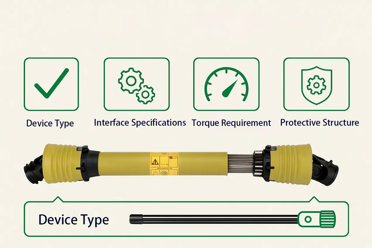 Прво, потребно је потврдити врсту пољопривредне механизације која се повезује. Различита опрема има различите захтеве за структуру, дужину, облик интерфејса, итд. карданског вратила. На пример: хоризонталне мешалице за напајање генерално захтевају карданска вратила са смичним вијцима или заштитом квачила; балирке за округле бале су погодније за моделе са попречним универзалним зглобовима да би се носили са радним условима са честим променама угла; а за опрему као што су вучни расипачи ђубрива, треба обратити пажњу на слободан ход издужења и увлачења осовине како би се осигурало да се осовина не поквари приликом скретања или преласка преко рова.