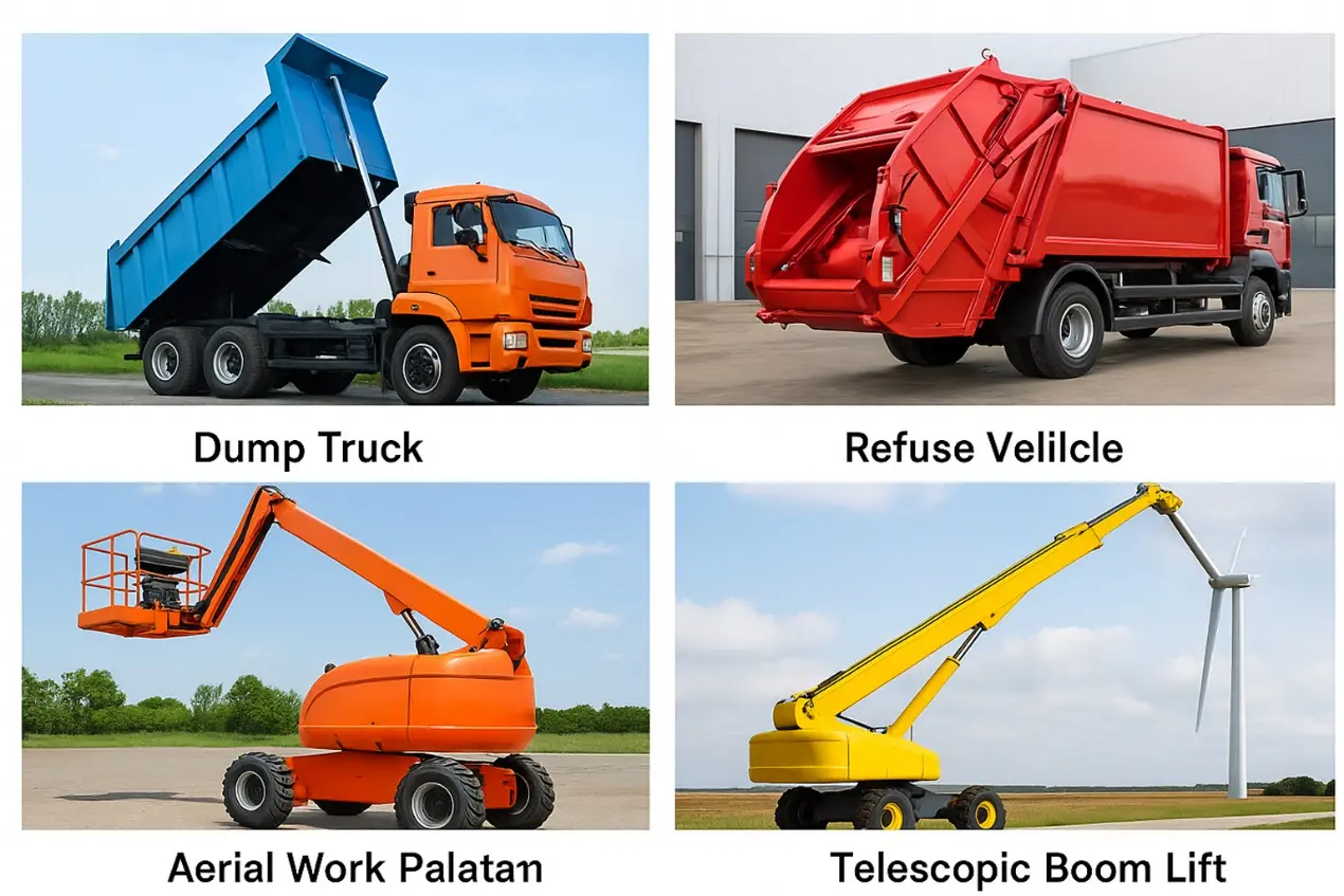 У киперима, вишестепени хидраулични цилиндри се често користе за подизање вагона како би се постигло брзо одлагање тешких терета; у санитарним камионима за смеће, хидраулични цилиндри покрећу отварање задњег поклопца и систем компресије како би се обезбедио ефикасан рад; у ваздушним радним платформама као што су аутодизалице или камиони са маказама, они контролишу руку за подизање и стабилно подижу радну платформу; поред тога, пољопривредни кипери камиони, хидрауличне задње плоче за приколице и забијачи грађевинских шипова такође се ослањају на своје поуздане вишестепене телескопске карактеристике да би завршили радна дејства.